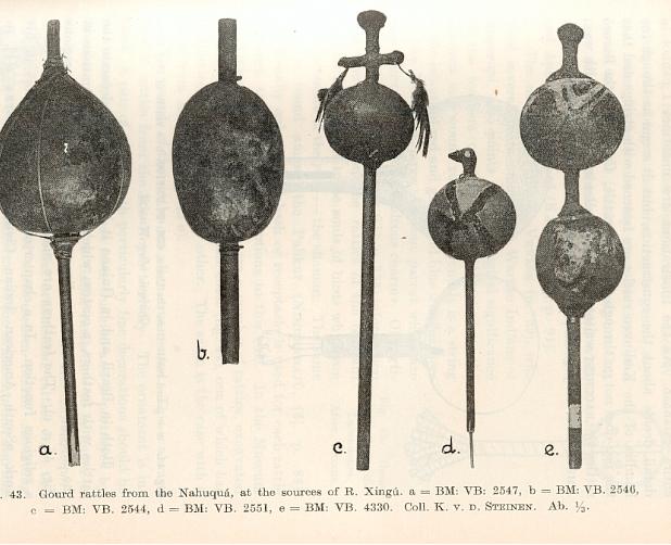 (...) Os instrumentos constituídos por cascas de frutas (sobretudo nozes Thevetia) seriam muito comuns, sobretudo no Amazonas (Tukano, Parintintin) e entre os Chané no Chaco, uma tribo Arowak e, como tal, migrada do Amazonas. Também ocorrem nos povos Karajá e Kayapó, no litoral entre os Patacho e Tupinambá; segundo informação de Nimuendajú, podem ser constatados entre os Canela e Krahó, que teriam substituído os cascos do tapir, praticamente extinto. No grupo Apinayé, os homens usariam na sua maioria cascos, as mulheres receptáculos de frutas para a confecção dos instrumentos respectivos. O uso desses instrumentos feitos com frutos difere daquele de instrumentos de cascos, uma vez que não seriam vinculados com cerimônias de puberdade feminina, mas sim relacionados com festas realizadas em períodos de abundância. Izikowitz traça paralelos entre as festas masculinas realizadas na região do Norte do Amazonas com as das cabeceiras do Xingu. Instrumentos com conchas seriam encontrados nos grupos Apinaye e Canela e outras tribos. Animais com cascos, porém, não existiam nas Antilhas e, assim, Izikowitz acha provável que os cascos tivessem sido substituídos por conchas; a coleção Tikuna do Museu de Göteborg possuiria um usado por uma menina. Entre os exemplos de instrumentos de outros materiais, Izikowitz cita uma faixa dos índios Campa com uma franja de vagens. Sistemática da maraca Especial consideração é dada aos instrumentos constituídos por um receptáculo ôco, no qual são colocadas pedras, sementes ou materiais similares (maraca). Izikowitz distingue três grupos, o instrumento de cabaça e formas similares de outro material; instrumentos originalmente não do grupo, mas que apresentam um idiofone-receptáculo a ele adaptado e bastões com o instrumento, assim como maracas tubulares. No primeiro grupo, distingue dois tipos, um caracterizado por uma haste pequena, sacudida pela mão, outro por uma haste longa, percutida no chão. O instrumento sacudido pode ser diferenciado, segundo Nordenskiöld, daquele que consiste da fruta Lagenaria inteira e do seu próprio cabo, e outro que apresenta um cabo que atravessa a cabaça. Os do primeiro tipo são, na sua maioria, encontrados no Chaco, geralmente abertos apenas no topo da haste e fechado com algodão ou cêra; fora do Chaco, frutos Lagenaria inteiros são encontradas entre os Guató, Paresí e Nahuquá; na maioria dos grupos do Brasil o instrumento é feito de cabaça (Crescentia cujete). A relação entre a Lagenaria e outras espécies de Curcurbita e a Crescentia é para Izikowitz de interesse, uma vez que se supõe que a Lagenaria veio do Pacífico em tempos pré-colombianos. Na consideração dos diferentes modos de prender a haste na cabaça, Izikowitz analisa exemplos dos Apinayé, Tukano e Tembé. As hastes das maracas do Rio Negro apresentam freqüentemente um perfil, sendo presas por um cordel na ponta superior, passando ao redor da cabaça. Um método similar pôde Izikowitz constatar nas cabeceiras do Xingú, nos grupos Auetó e Nahuquá. Os instrumentos Nahuquá exemplificariam como instrumentos podem variar dentro de uma mesma tribo: a ponta de cêra é às vezes modelada com a forma de cabeça de animais ou em forma de cruz. As tribos de Roraima apresentam, segundo Izikowitz, um método especial de segurar a cabaça. Com a ponta superior adelgaçada, a haste é colocada dentro de um tubo para impedir que a cabaça escorregue. Exemplos de instrumentos nos quais a haste não atravessa a cabaça são encontrados nos grupos Kadiuveo, Kaingang e Bororo. (...)