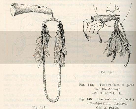 Os indíos de cultura Kayapó (Pao dArco) teriam pequenas cabaças que produzem um só tom. Dentro do apito há uma pequena bola de madeira que rola e produz um trêmulo como nos apitos de polícia. Também são usados no pescoço e se relacionam com a chuva. Apitos de madeira quadriculares foram registrados nas culturas Kadiuveo e Chamakoko e consistem de uma peça de madeira alongada com uma secção horizontal retangular, de forma oval no vertical. Só tem orifícios num dos lados curtos e são amarrados também no pescoço. No grupo de flautas transversais com orifícios, Izikowitz cita um exemplo dado por Manizer relativo à nação Bororo de uma flauta fechada de ambos os lados pelos nós naturais do bambú, com três orifícios, um no meio, que é por onde se sopra, e dois nas pontas. As flautas transversais com seis orifícios foram trazidas pelos europeus; tendo sido na Europa muito comuns no século XVII. É provável que tenha sido propagada a partir dessa época no Brasil. Das outras flautas, Izikowitz distingue vários tipos. Os índios de cultura Kaingang possuem longas flautas, de mais de um metro, cobertas de trançado, fechadas nas duas pontas, com dois orifícios na ponta distante do bocal, aberto numa das pontas. Possuem também uma flauta que é assoprada com o nariz. Na coleção da tribo Parintintin do Madeira existente no Museu de Götenborg há vários tipos de flautas transversais: algumas com um simples bocal numa das pontas e um orifício próximo da ponta aberta, outras duplas, de 100,5 cm de comprimento, nas quais cada metade tem um bocal e um orifício de tom. Na cultura Schiriana há uma flauta similar, também fechada nas duas pontas, mas com três orifícios de toque, o que é um modêlo comum nas Guianas. Ao lado dos dois orifícios na ponta mais distante há também dois na ponta mais próxima, perto do bocal. Os índios de cultura Palikur usam para assoprar o segundo dos furos. A maioria das tribos que usam esta flauta executam-na pelo nariz. Quanto às flautas com um orifício de sôpro no septum, Izikowitz dá exemplos das tribos Botocudo e Kaingang-Kamé. São tocadas pelo nariz e sustentadas obliquamente. A ilustração da flauta Kaingang descrita por Manizer refere-se a instrumento conservado na coleção Fric em Praga, tendo um tubo de um metro de comprimento e dois orifícios na ponta distante e um na ponta próxima. Na coleção Nimuendajú referente à tribo Apinayé do Museu Götenburg há também uma flauta nasal similar, com 19,5 cm de comprimento, com tubo inteiramente aberto; uma excisão no septum marca o ponto onde o nariz deve ser colocado. Seria difícil dizer se os tubos das flautas Pã do Peru e as flautas do Brasil Oriental teriam a mesma origem. Fora da América do Sul, tais flautas encontram-se em certas partes da Oceania, Indonésia e Málaca. Quanto às flautas de sôpro no topo ("end-flutes"), onde o tubo é aberto, Izikowitz distingue dois tipos: 1) flautas de topo com paredes retas ("simple end-flutes") e 2) flautas de topo com entalho (tipo quena). O primeiro tipo de flauta ocorre esporadicamente na América do Sul. No Chaco, por exemplo, é rara, sendo substituída pela do tipo quena. Flautas de tíbia, na sua maioria com três furos, são encontradas em tribos do Peru e Equador. A distribuição da flauta de topo simples na América do Sul indicaria claramente que seria um elemento cultural excepcionalmente antigo, o que é provado pela sua ocorrência em determinado estrato cultural Tainian, em Arica, Ita, Tiahuanaco e no Chaco. Quanto à quena, é encontrada no Peru tanto no período pré- como pós-colobiano, no Chaco, Mojos, ao longo do rio Amazonas e seus tributários, ao norte até Motilon, ao Leste até a Guiana. Não se encontram nem nas Indias Ocidentais, nem entre os povos Ge e Tupi-Guarani. De cana e osso são as mais comuns no Peru antigo; de cana entre os índios do Chaco e os do Rio Negro. Usualmente, as quenas dos descendentes das antigas culturas, os Quechua e Aymara, possuem em geral sete orifícios, assim como um para o polegar e às vezes um para o mínimo na parte lateral da ponta distante. Esse instrumento produz aproximadamente a escala diatônica, sendo provavel uma influência pós-columbiana. No Chaco, ocorrem dois tipos de quena, uma delas entre os Ashlushlay, Choroti e Chané, similar à flauta de topo simpres encontrada nessa região, sendo a quena mais estreita e possui um entalhe; característicos são os orifícios estreitos, retangulares e para o polegar. O outro tipo tem um orifício para o mínimo colocado à esquerda ou à direita, dependendo da mão que o músico usa próximo da ponta mais distante; ela apresenta seis orifícios. As quenas de osso no noroeste do Brasil apresentam coberturas de cêra na parte mais próxima, com a finalidade de estreitamento da abertura, possuindo em geral três orifícios, mais raramente, quatro. Em alguns casos, são de ossos humanos. Muitas tribos, como Makushi, Arekuna e Patamona, teriam antigamente instrumentos com a abertura totalmente coberta com cêra. A área de distribuição da quena de osso é principalmente delimitada pela costa peruana e o território ao norte do rio Amazonas. Quanto às flautas nasais, Izikowitz trata da sua ocorrência nas culturas Jivaro, Kaingang e Botocudo, Pareci e Nambicuara, Apianyé, assim como na Guiana e na Califórnia. Teria surgido esse modo de tocar em várias partes da América ou haveria alguma conexão?. O modo de tocar varia com a colocação do nariz no septum, segundo Manizer. O tipo de flauta nasal dos Jivaro é encontrado no Peru e na cultura Kaingang, não havendo porém informação se seria tocada mesmo com o nariz. Índios da tribo Kaingang assopram pelo nariz a flauta do tipo de um orifício no septum. As flautas nasais das culturas Pareci e Nambicuara seriam antes apitos ressoadores com dois orifícios. Izikowitz vê uma conexão entre a flauta nasal Apinayé sem orifícios com a do grupo Botucudo