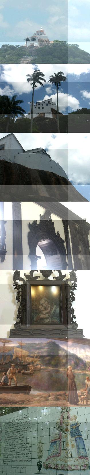 Vila Velha. A ermida conventual de Nossa Senhora da Penha, dominando Vila Velha e Vitória, constitui marca simbólica, religiosa e cultural do Espírito Santo e patrimônio histórico-cultural de primordial relevância na história das relações entre a Europa e o Brasil. A escolha do local não pode ser entendida somente pela sua importância estratégica, como salientado por vezes na literatura. O interesse do monumento não se restringe também às suas qualidades pitorescas e artísticas (imagem de Nossa Sra. das Alegrias, século XVI). A consideração do conteúdo espiritual e das características da devoção à N. Sra. da Penha no âmbito luso e brasileiro é essencial para a compressão da simbologia específica do local e do complexo arquitetônico e paisagístico que determina. A rocha, o penhasco e a montanha se inserem aqui num processo amplo de atribuição de significados à natureza e da produção de sentidos culturais. Estudos comparativos com outras igrejas da mesma devoção em Portugal e no Brasil permitem o reconhecimento de elementos comuns e traços diferenciadores. A veneração da imagem e a importância da igreja como centro de peregrinações manteve-se através dos séculos. Já no século XVII, de 1639 a 1643, a capela original, fundada em 1558 pelo Frei Pedro Palácios, foi alvo de ampliações, significativas transformações ocorreram no século XVIII, trabalhos de renovação no século XX. O papel de N. Sra. da Penha na construção de imagens da história local e regional fica evidente nas telas ilustrativas de Benedito Calixto conservadas no corredor lateral do templo. A relevância atual para processos identificatórios regionais manifesta-se em projetos escolares e pinturas murais.
